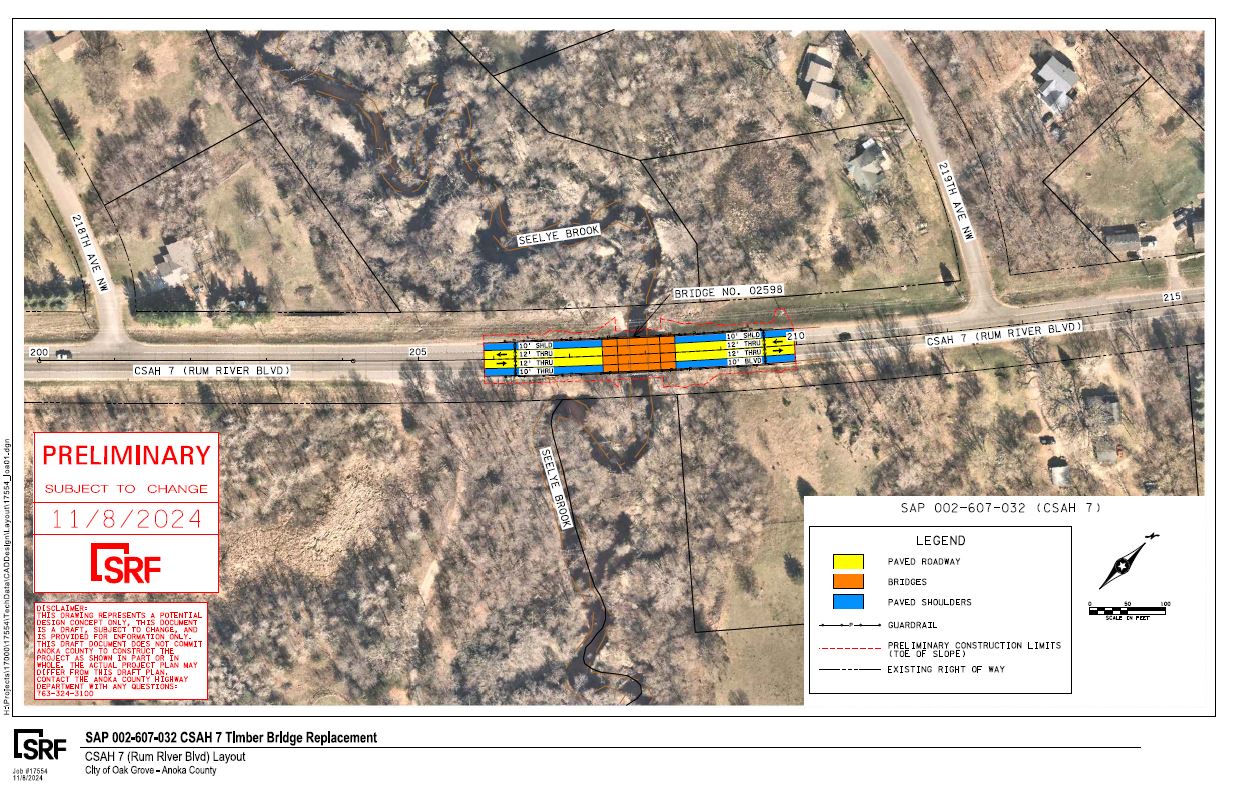 This project consists of the teardown and replacement of the Seelye Brook Bridge, at CSAH 7 (Rum River Boulevard) between 218th Avenue NW and 219th Avenue NW. This timber bridge was originally built in 1984 and is being replaced with a prestressed concrete beam bridge. This project will involve a full closure of Rum River Boulevard at the Seelye Brook crossing north of 218th Avenue NW, starting on March 9th for three months. Anoka County is working in partnership with the City of Oak Grove.